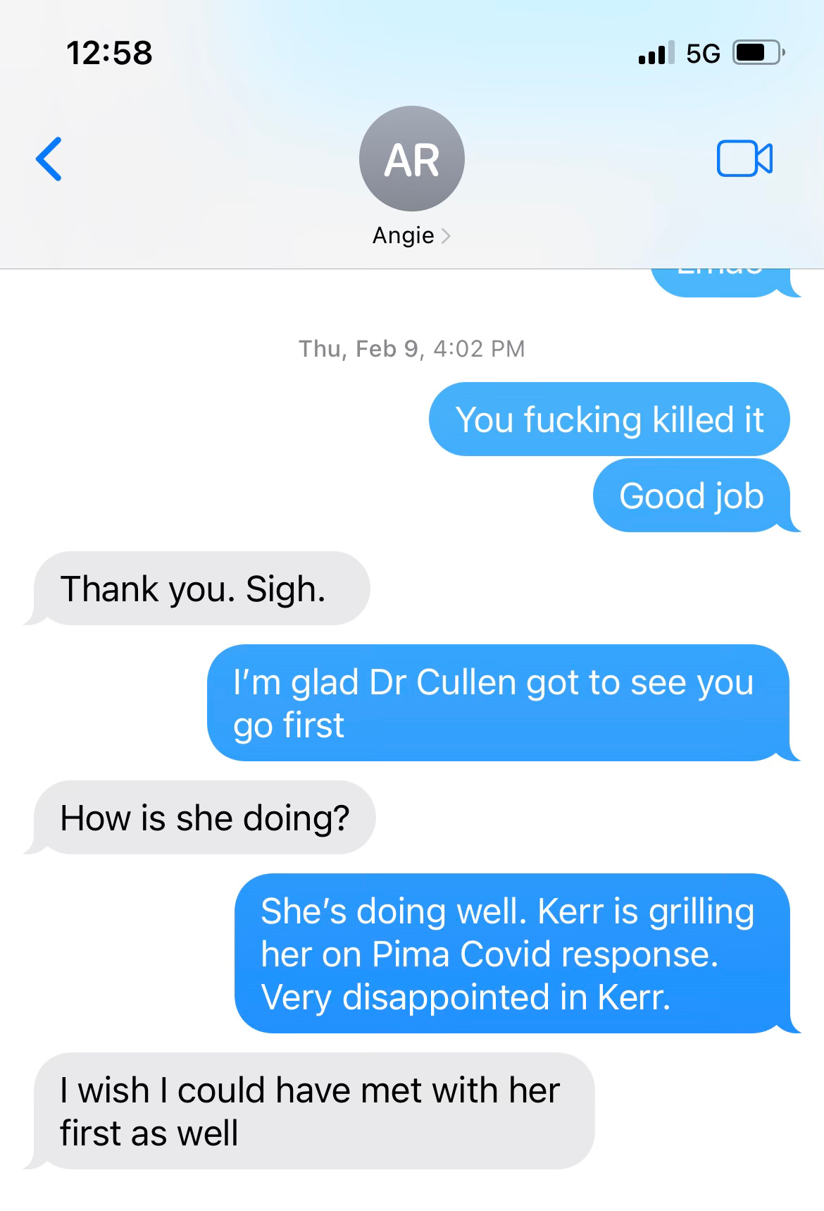 “[Sen Sine] Kerr is grilling [Dr. Theresa Cullen] on Pima Covid response. Very disappointed in Kerr.” - Rebecca Beebe, the Deputy Director of Public Affairs & Legislative Director for Gov. Katie Hobbs in a text to DES director nominee Angie Rodgers